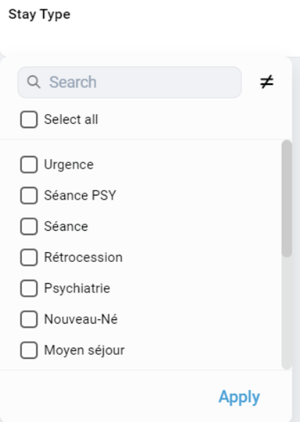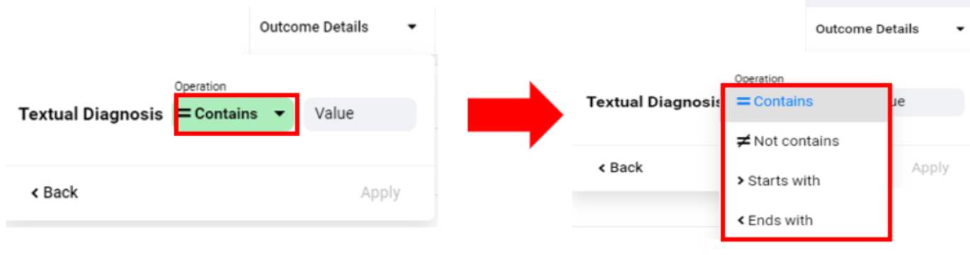 Le filtre « Like » vous permet de saisir un mot-clé pour appliquer les critères. Les comparaisons suivantes peuvent être appliquées : contient, ne contient pas, commence par, se termine par.