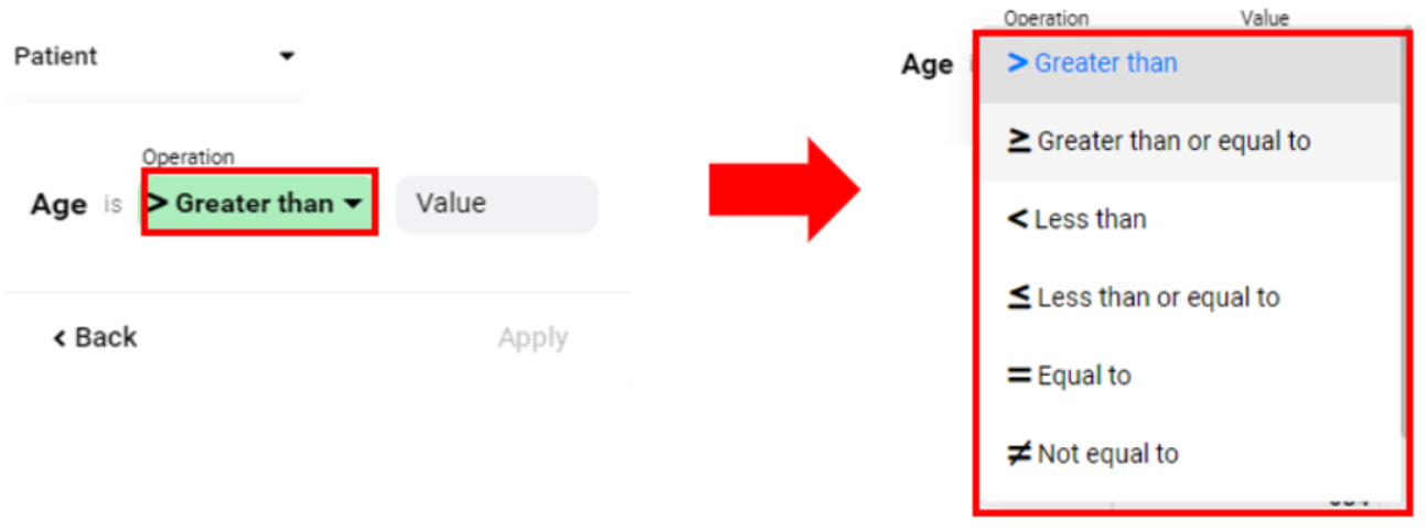 Les filtres de plage permettent de définir des comparaisons sur des valeurs numériques comme conditions de : majorité, minorité, égalité ou non, ou inclusion.