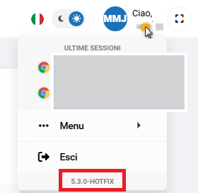 Le informazioni sulla versione sono disponibili cliccando sul nome utente in alto a destra nella pagina. Il menu che appare mostra la versione attualmente in uso.