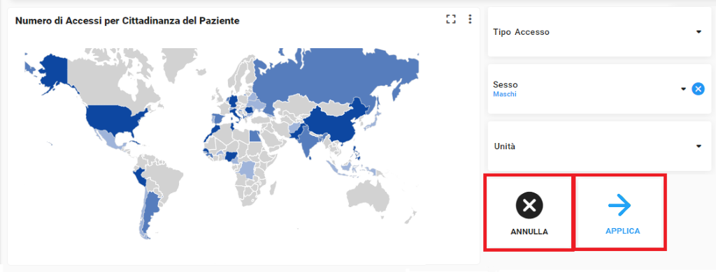 Nelle dashboard è possibile trovare pulsanti con interazioni al click di diversi tipi. Seguire sempre le indicazioni testuali riportate in prossimità del pulsante. Ecco alcuni esempi: