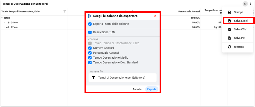 Il formato di salvataggio Excel permette di scegliere il contenuto da esportare, selezionando le grandezze da includere o meno nel file finale, del quale è possibile scegliere il nome.